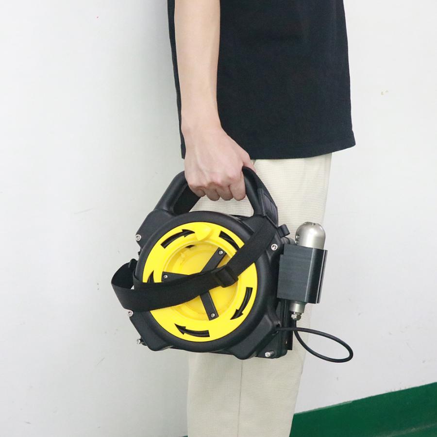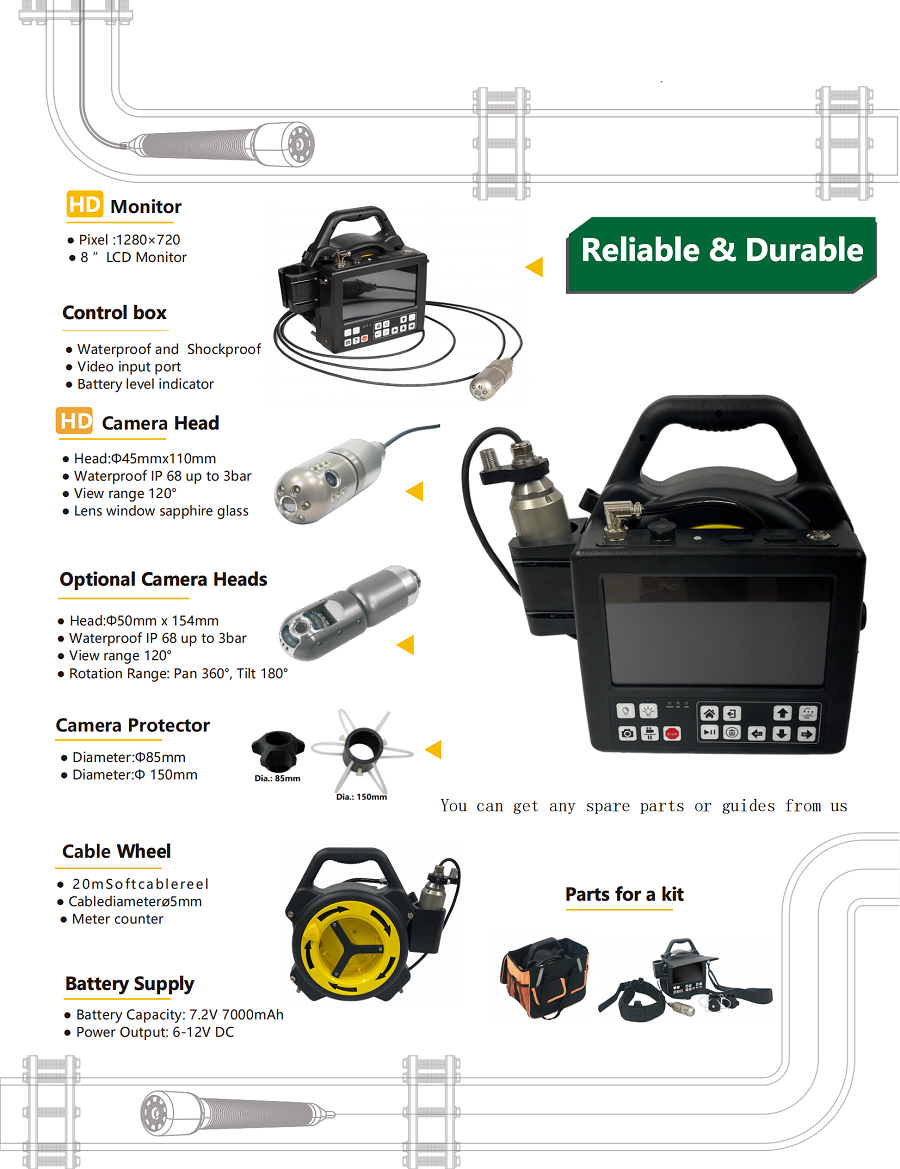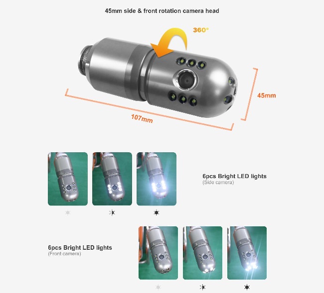 Systém je dodáván s 20 m flexibilním kabelem, který umožňuje snadný přístup i do těch nejmenších prostor. Kabel je úhledně uložen v těle jednotky, což zvyšuje komfort při přepravě a skladování. Funkce odvinuté vzdálenosti vám poskytne přesné informace o tom, kolik metrů kabelu je již odvinutých. Kabel je s duální kamerou hlavicí, která umožňuje současný přímý i boční pohled s rotací 360° pro maximální pokrytí prostoru. Pořízený video záznam je v HD kvalitě (1920 x 720 px) a se zvukem. Kamerová jednotka je z odolného nerezového materiálu s rozměry 45 mm x 110 mm.
