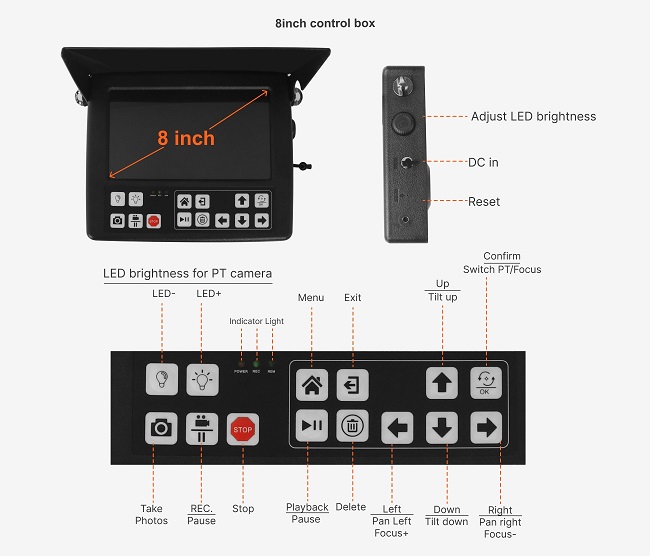 Ovládací jednotka OXE CHIMCAM PROFI 360 je odolná vůči povětrnostním vlivům a vybavená ochranným slunečním štítem, což zajišťuje spolehlivý provoz i za nepříznivých povětrnostních podmínek. Monitor je 8" barevný HD IPS LCD displej, který poskytuje ostrý a jasný obraz během inspekcí. Předinstalované funkce zahrnují záznam videa a snímků přímo na USB paměťové zařízení, mikrofon pro zvukové záznamy a dobíjecí baterii pro maximální mobilitu (výdrž cca 4 - 5 hodin).