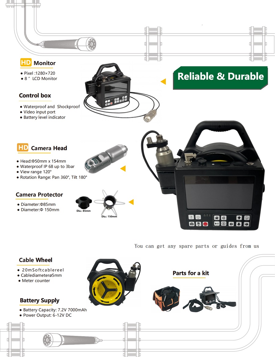 Systém je dodáván s 20 m flexibilním kabelem, který umožňuje snadný přístup i do těch nejmenších prostor. Kabel je úhledně uložen v těle jednotky, což zvyšuje komfort při přepravě a skladování. Funkce odvinuté vzdálenosti vám poskytne přesné informace o tom, kolik metrů kabelu je již odvinutých. Kabel je s duální kamerou hlavicí, která umožňuje současný přímý i boční pohled s rotací 360° pro maximální pokrytí prostoru. Pořízený video záznam je v HD kvalitě (1920 x 720 px) a se zvukem. Kamerová jednotka je z odolného nerezového materiálu s rozměry 50 mm x 154 mm.