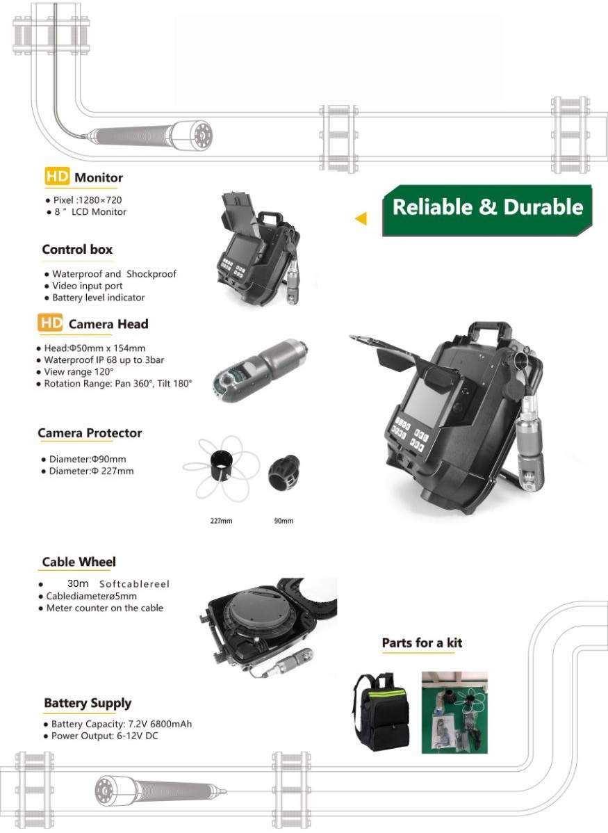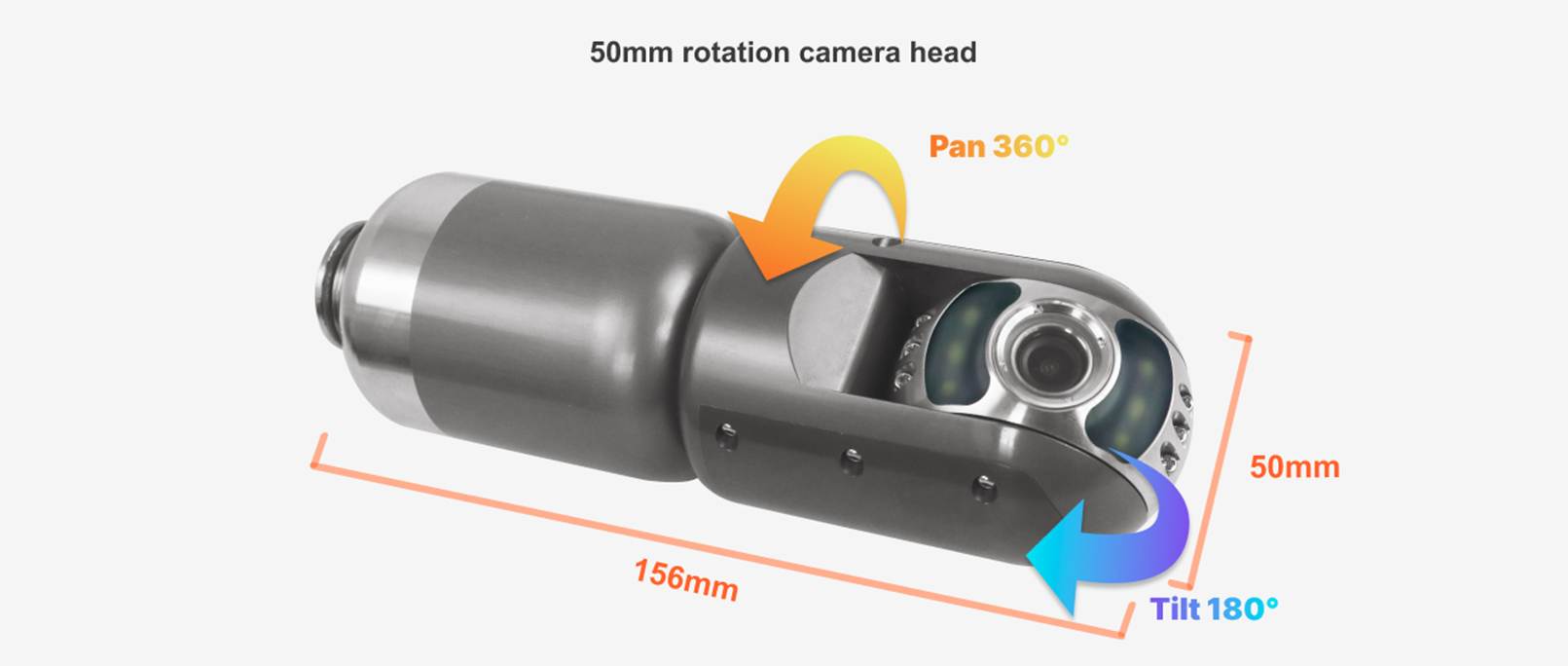 Kamerová hlava s průměrem 50 mm a délkou 154 mm nabízí pan (360°) a tilt (180°) rotaci pro maximální pokrytí kontrolované oblasti. Konstrukce z nerezové oceli a safírového skla zaručuje dlouhou životnost a odolnost vůči mechanickému poškození i vlhkosti (IP68). Osvětlení zajišťují 4 výkonné nastavitelné LED diody, které umožňují práci i v úplné tmě. Záznam videa probíhá v HD kvalitě (1280 × 720 px) se zvukem.