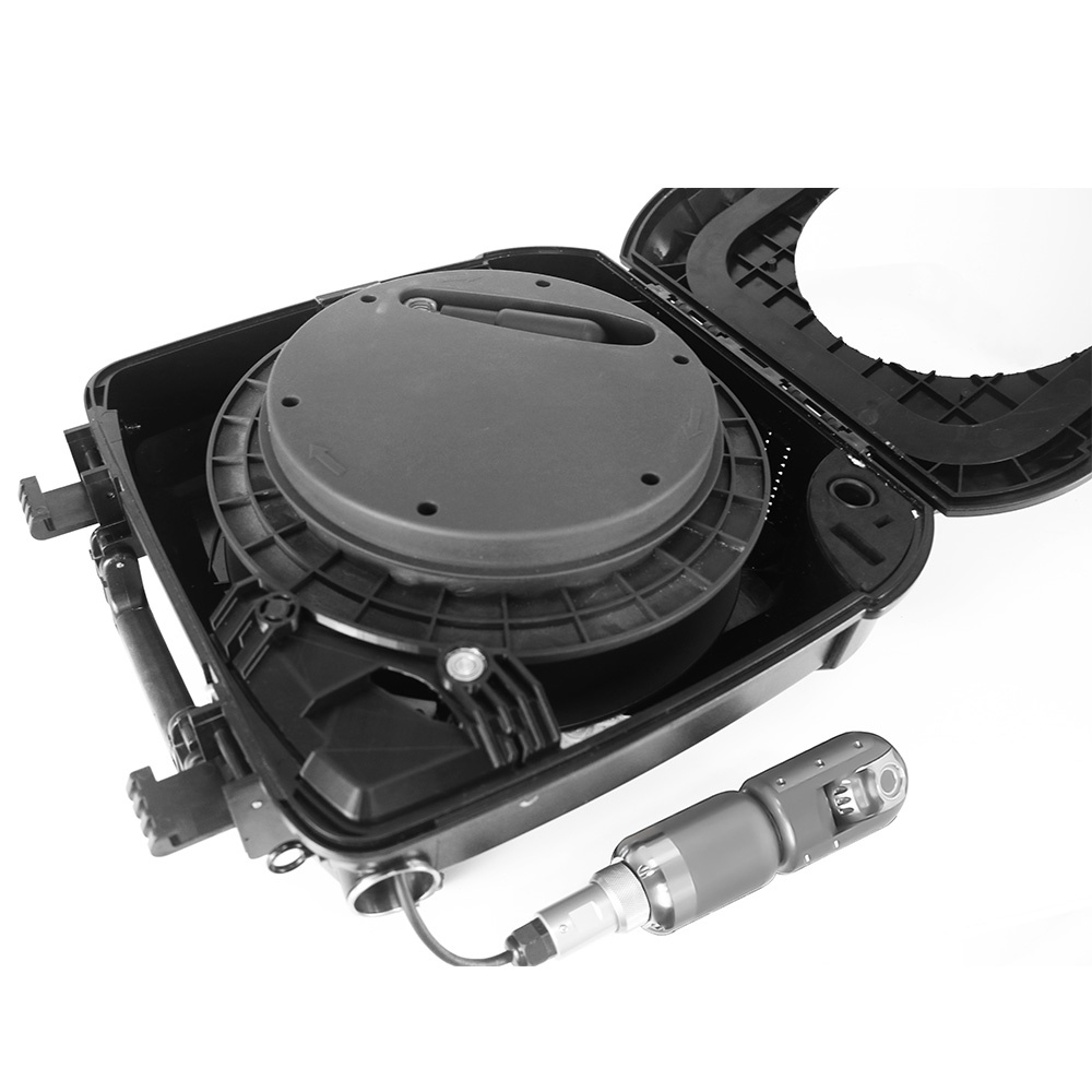 Součástí systému je 30ti metrový flexibilní kabel o průměru 5 mm, který umožňuje snadný přístup i do úzkých nebo těžko dostupných prostor. Kabel je úhledně uložen v těle jednotky, což usnadňuje přepravu i skladování. Digitální měřič délky zobrazuje na displeji přesnou hodnotu odvinutého kabelu.