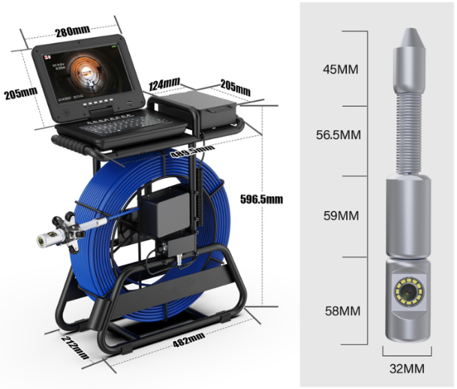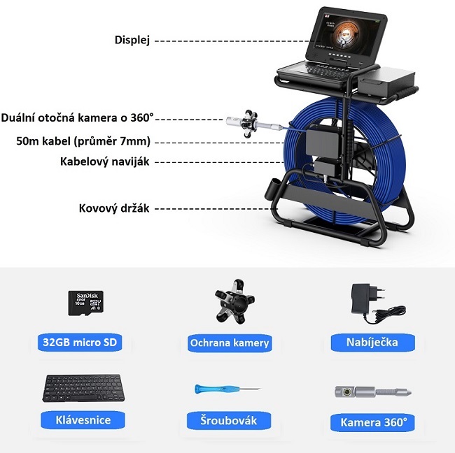 Inspekční kamera disponuje 50m tlačným kabelem z pružné nerezové oceli o průměru 7mm. Čočka kamery je z odolného safíru. Kamerová hlavice disponuje dvojicí kamer. Jedna je umístěna na čele hlavice a zaznamenává obraz před kamerou, druhá - rotační 360° je na boku kamerové hlavice. Kamerová hlavice disponuje průměrem 32 mm a je možno s ní pohybovat dokola s rotací 360°. Je voděodolná s ochranou IP68. Kamera nabízí široký úhel záběru 145° a ve zhoršených podmínkách lze použít LED přísvit s nastavitelnou intenzitou v pěti úrovních. Jako volitelné příslušenství lze dokoupit lokátor 512 Hz, díky kterému jednoduše určíte, kde se kabel s kamerou nachází.